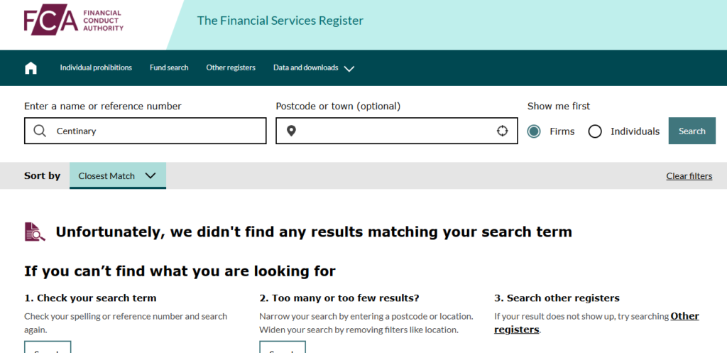 Centinary also suggests that it maintains operations or a presence in the United Kingdom. To verify this claim, we reviewed the official register of the UK Financial Conduct Authority (FCA). No listing was found for Centinary or any clearly associated entity.