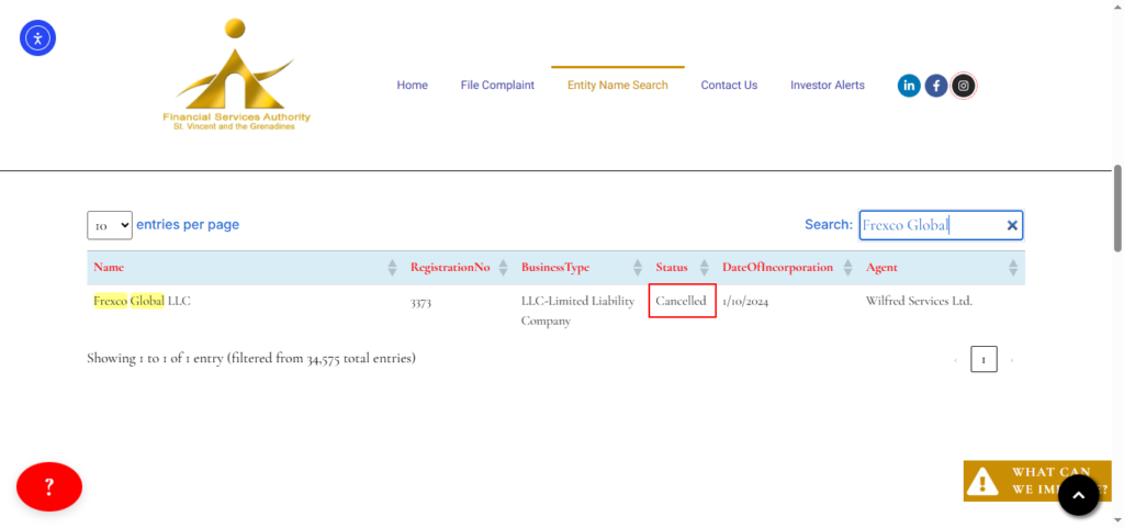 Centinary states that it operates as a trademark under Frexco Global LLC, allegedly incorporated in Saint Vincent and the Grenadines. While a search of the Financial Services Authority (FSA) registry shows that a company under this name was registered, the official records also indicate that its status is “Cancelled.” This is a critical detail that significantly impacts the credibility of the entity.