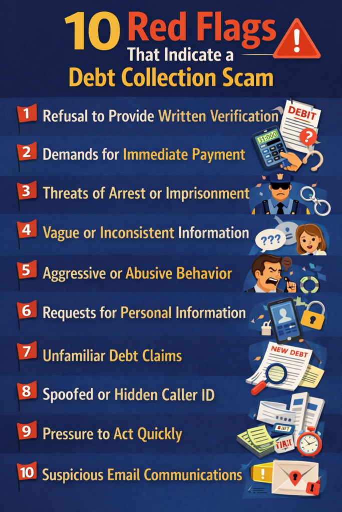 Recognizing the warning signs of debt collection fraud can save you from financial loss and identity theft. Here are the most common indicators that you’re dealing with a scammer rather than a legitimate debt collector:
