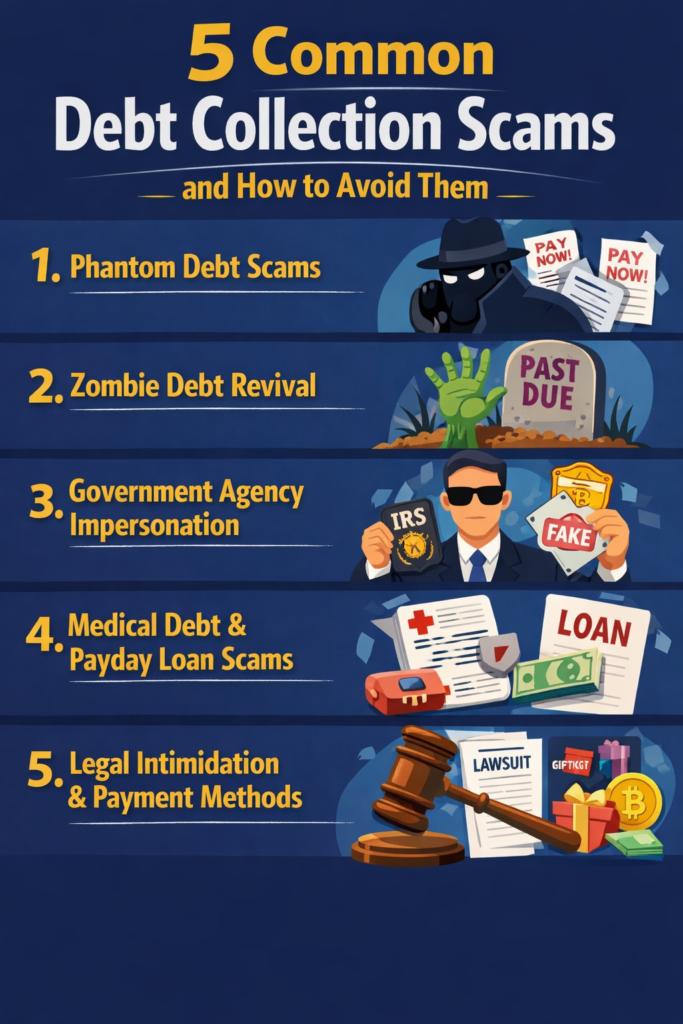 Understanding the specific types of scams helps you recognize and avoid them. Here are the most prevalent debt collection fraud schemes: