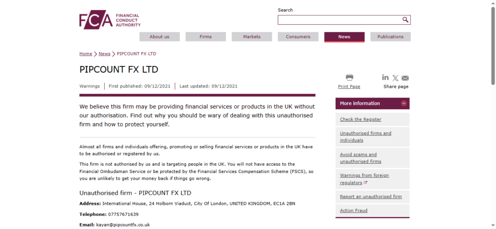 Warning – UK’s, Financial Conduct Authority has reported PIPCOUNTS