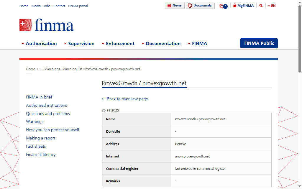 Warning – Switzerland regulator, Financial Market Supervisory Authority has reported ProVexGrowth