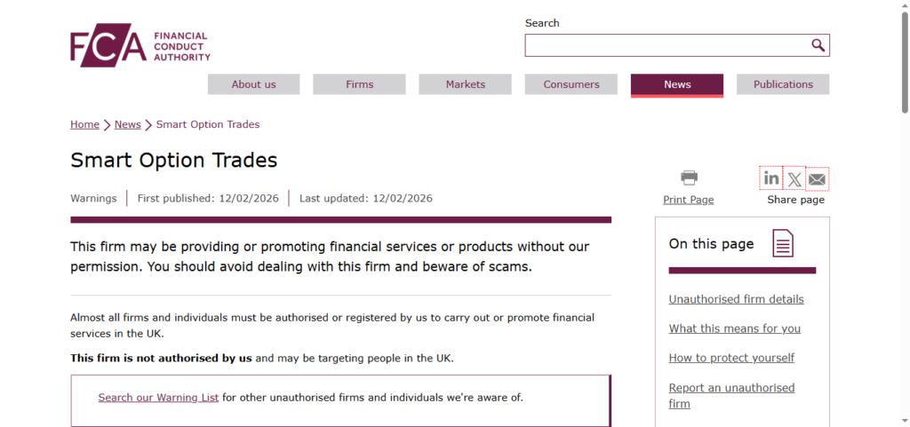 Warning – Financial Conduct Authority (UK) has reported Smart Option Trades