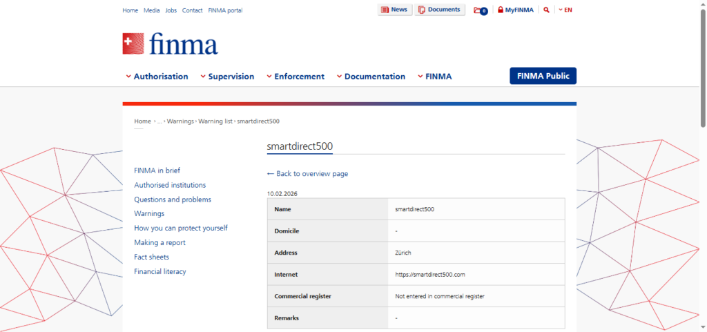 Warning – FINMA (Swiss Financial Market Supervisory Authority), Switzerland has reported smartdirect500