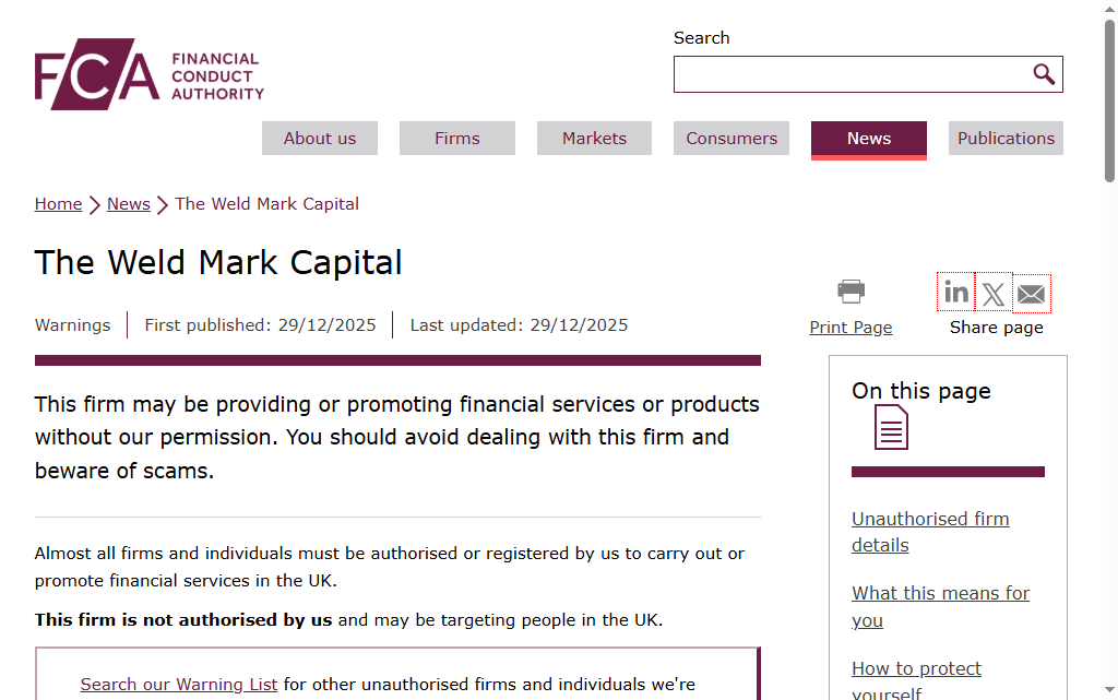 On 29 December 2025, the UK Financial Conduct Authority (FCA) issued a clear warning regarding The Weld Mark Capital. In its notice, the FCA stated that “this firm may be providing or promoting financial services or products without our permission” and advised consumers to avoid dealing with the firm and remain alert to potential scams. Such warnings are typically issued when a company is suspected of operating illegally or misleading the public.